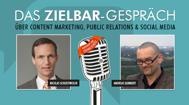 Für das Gemeinschaftsprojekt ZIELBAR hat Autor Stefan Schütz den PR-Kollegen Nicolas Scheidtweiler und mich zu Content Marketing, Public Relations und Social Media befragt. Man kann nicht gerade sagen, dass wir da immer einer Meinung sind. Umso besser, finde ich. Denn das zeigt, dass bei neuen Themen wie Content Marketing noch einiges in Bewegung ist.